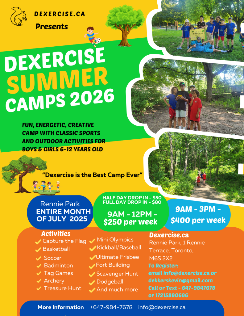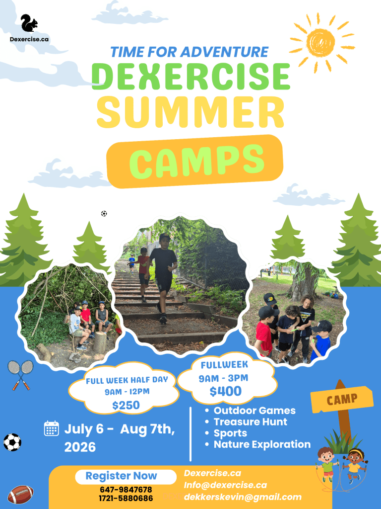 Our Summer Camps are so much fun that we have a 100% participant return rate. Every single person who has been at the camp has come back for more. The camps are an amazing fun experience filled with movement, exercise, team building and exploration. We do Treasure hunts, Nature Hikes, Outdoor Challenges, Fun Sports and Games including Soccer, Volley Ball, Tag Games, Badminton, Dodgeball, Tug of War and much more. To book please Contact Coach Kevin at 647-9847678 or 17215880686. Email at info@dexercise.ca or dekkerskevin@gmail.com